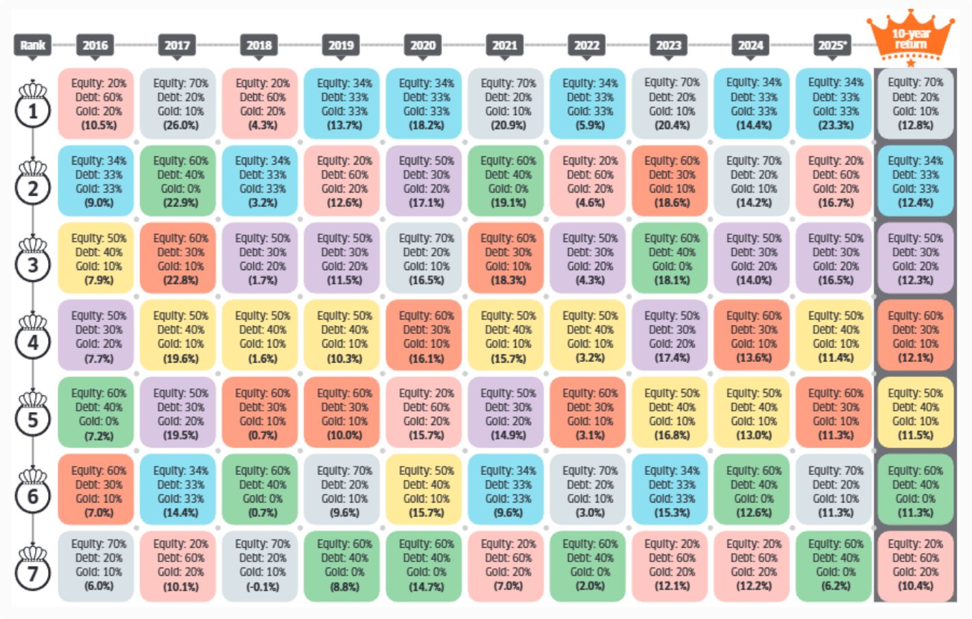 This analysis compares the performance of seven different asset allocation strategies across the 10-year period. The options vary significantly in their exposure to Equity, Debt, and Gold: