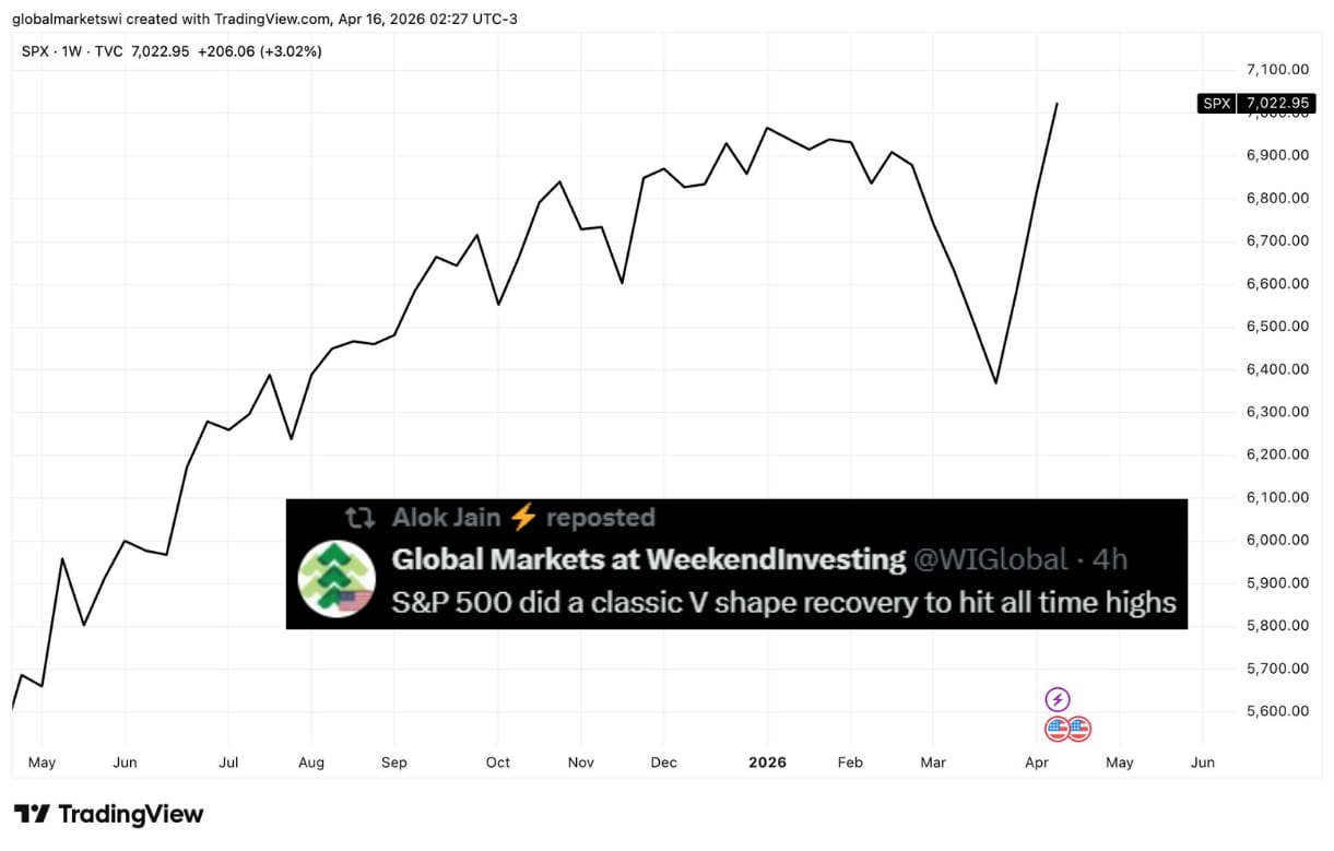 A tweet from Global Markets at Weekend Investing highlighted that the S&P 500 has seen a classic V-shaped recovery and is at an all-time high.