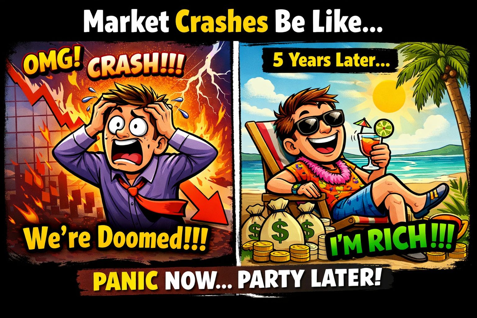 Context: Historical data shows that after a 30% market correction, the average 5-year return is 88% with a 98% win rate. Knowing this, how does your strategy change when the market turns red? |