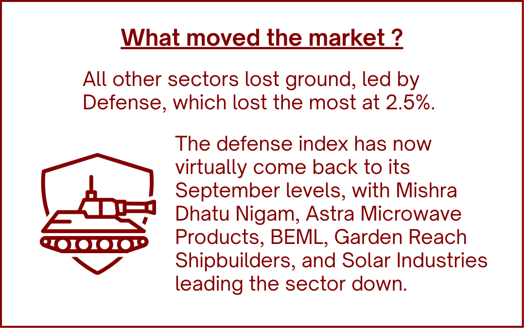 The weakness is more pronounced in the broader market. Nifty Junior was down more dramatically, at 0.98%, bringing it very close to its September lows.