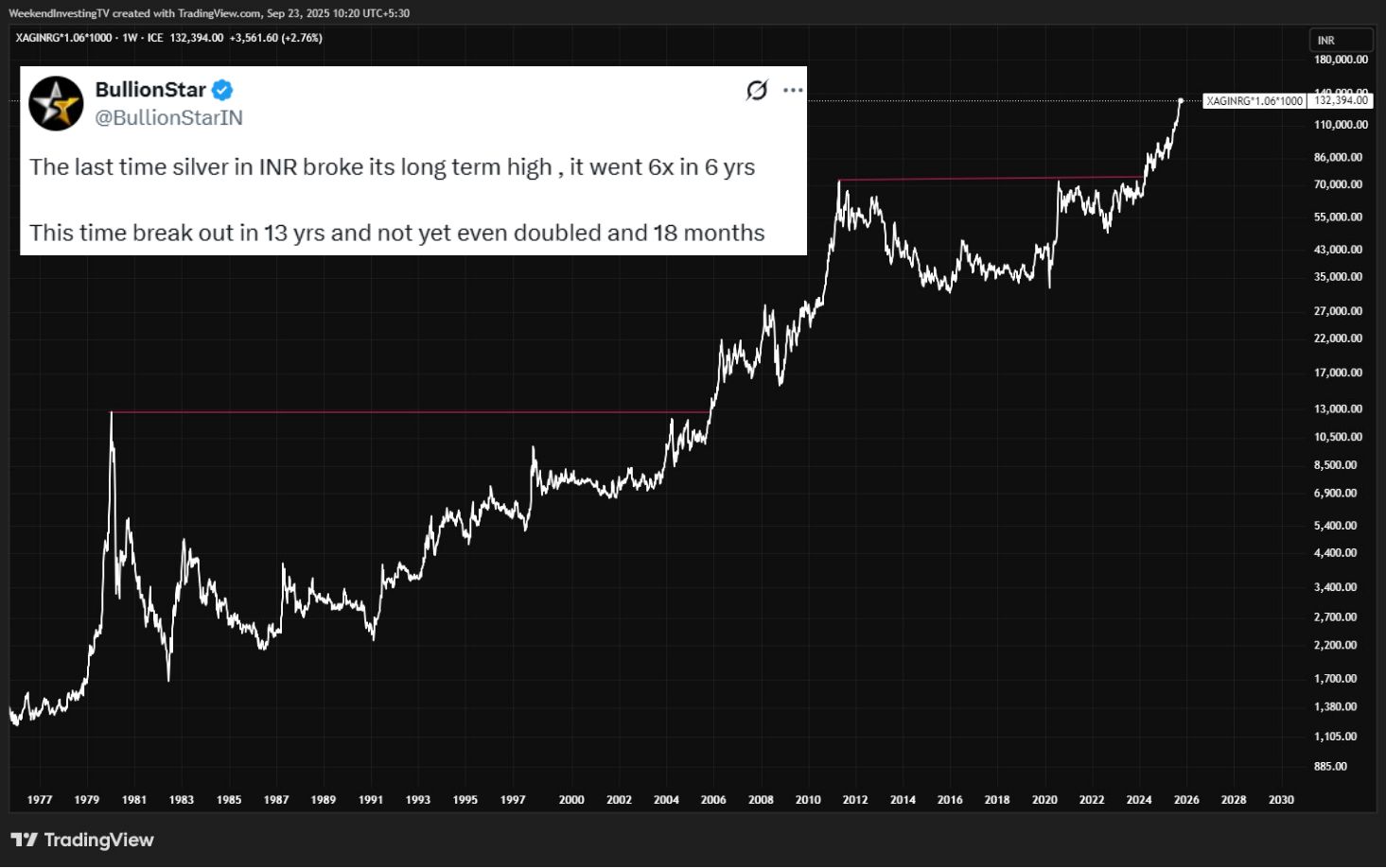 When silver breaks its long-term high against the INR, the subsequent rally has historically been characterized by massive, swift, and sustained growth, exemplified by the 6x gain over six years following the 2006 breakout.