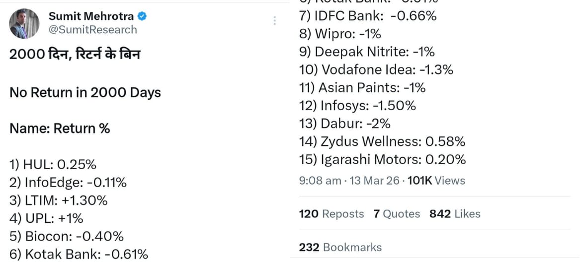 Imagine holding a portfolio of industry leaders for nearly six years and seeing the needle barely move. Recent data highlights a startling trend: 15 prominent stocks—including household names like HUL, Asian Paints, and Infosys—have delivered effectively zero returns over the last 2,000 days.