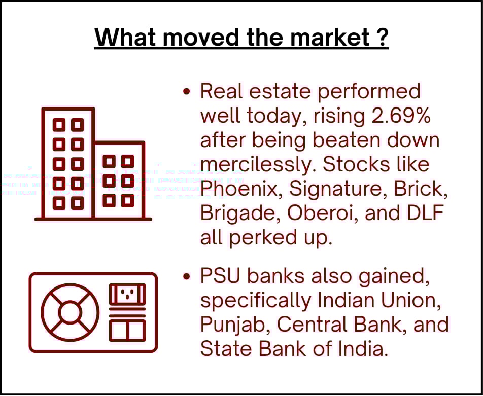 While Public Sector Enterprises and Nifty IT did not participate as much, there were gains of 1% to 2.5% across oil and gas, defense, energy, infrastructure, private banks, FMCG, pharma, consumption, auto, financial services, capital markets, metals, PSU banks, and real estate.