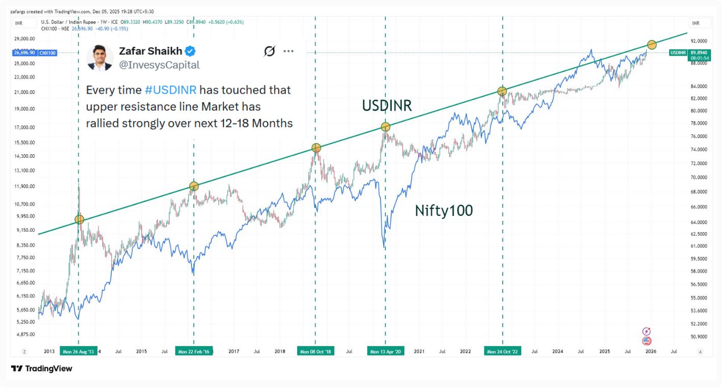 Data presented by market analyst Zafar Shaikh (known as Invesys Capital on X) suggests a compelling correlation between the USD/INR exchange rate and Indian equity bull runs. Historically, whenever the USD/INR pair hits its upper resistance line—meaning the Rupee reaches a point of significant weakness—it acts as a precursor to a massive market rally over the following 12 to 18 months.