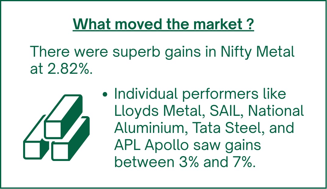 The Nifty Next 50 also looked good, with DLF, TVS Motors, Motherson, and Tata Power doing well, alongside Zinc and Vedanta.
