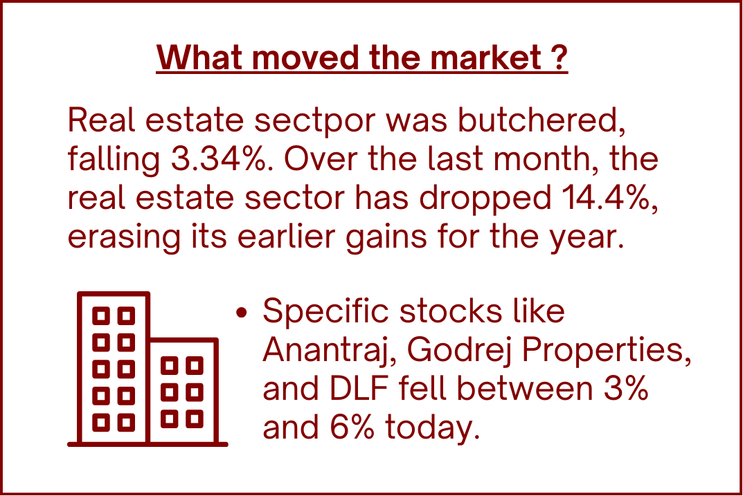 Specific stocks took significant hits. Zomato fell 6% following the notification that Deepinder Goyal is leaving the CEO position. Cipla dropped 4% and Adani Ports fell 7%.