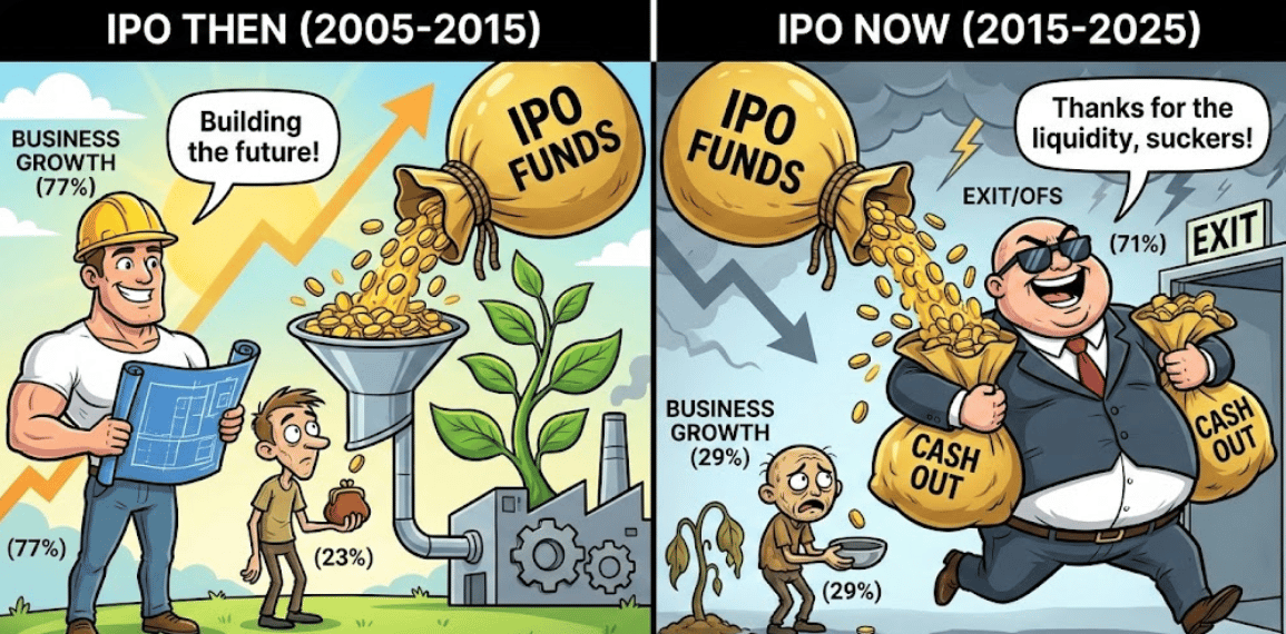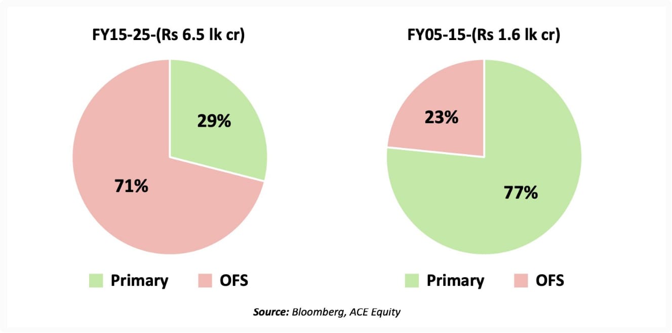 71% for Offer for Sale (OFS): The majority of the money is now simply "changing hands." It goes to the private equity firms, VCs, or promoters who are cashing out.