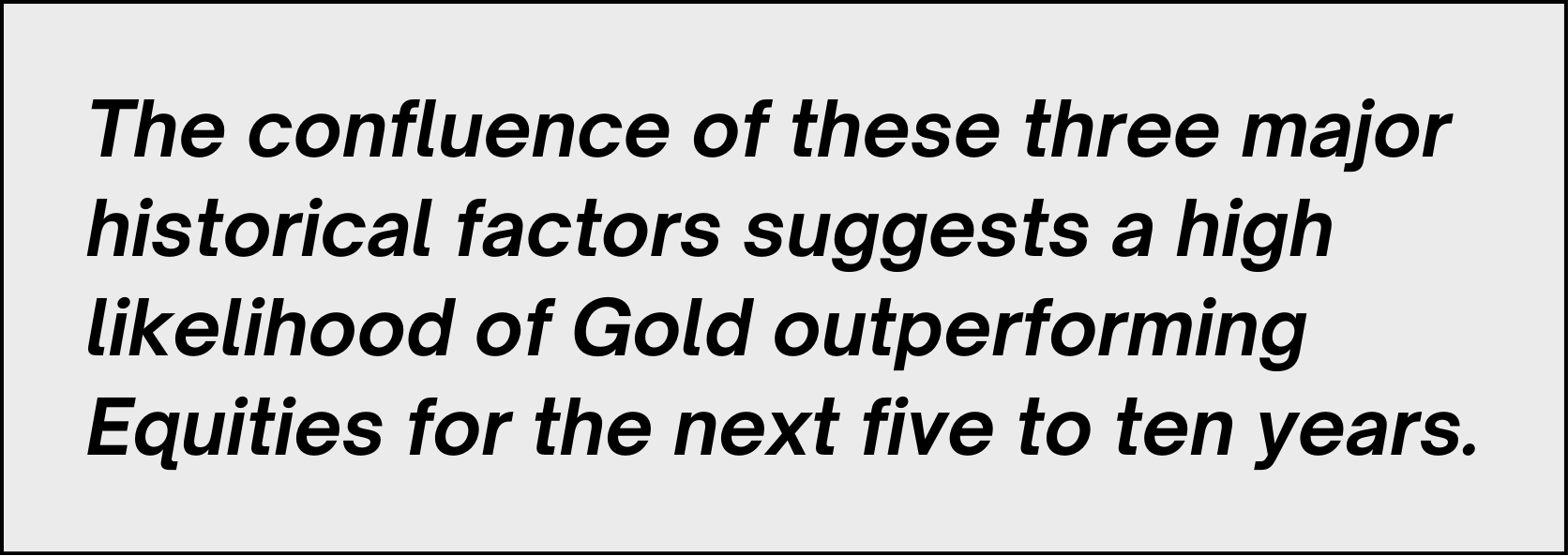 What makes the current situation potentially ripe for a prolonged Gold outperformance cycle? The speaker notes that the current environment combines the key features of the previous Gold-outperforming cycles: