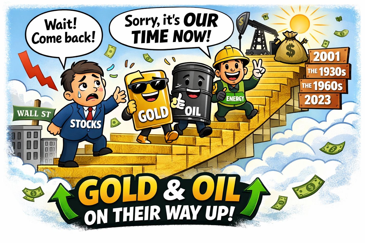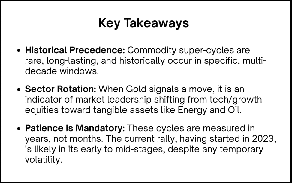 This signal does not suggest that the stock market will crash or that you should stop investing in equities. Instead, it highlights a rotation of leadership. During these periods, assets like Gold, Oil, and Energy stocks tend to deliver explosive, multi-year returns, often significantly outpacing the broader indices.