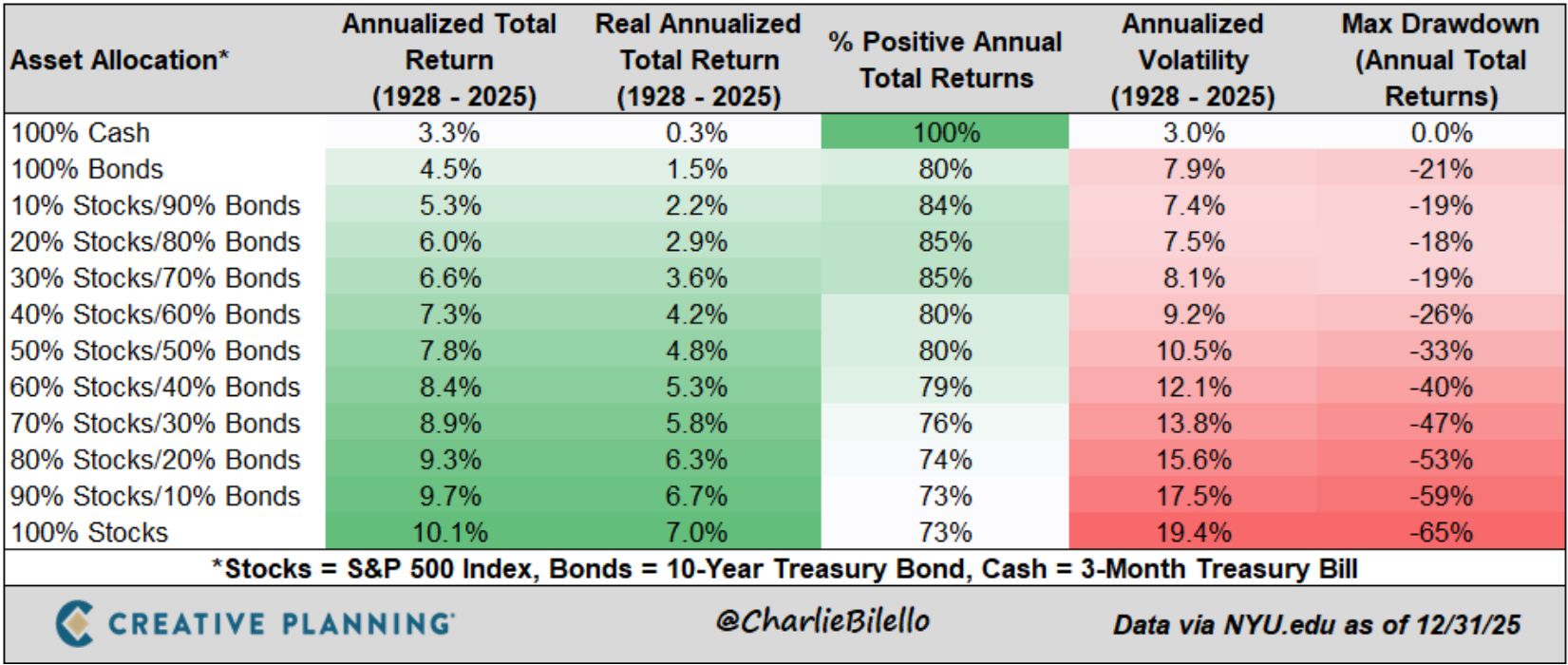 The beauty of asset allocation lies in the middle ground. Bilello’s data shows a linear relationship: as you move from 10% stocks to 100% stocks, your returns rise, but so do your drawdowns.