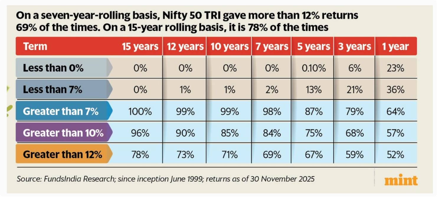 If you stay invested for 10 years, there is a 99% probability of earning more than 7% returns. Extend that to 15 years, and the probability of earning at least 7% hits a perfect 100%.