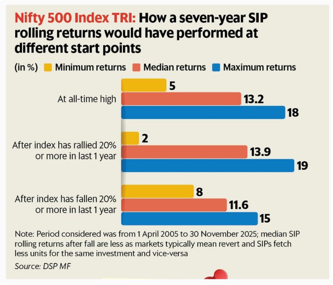 Many investors freeze when the market hits an All-Time High (ATH), fearing a correction. However, the data shows that even if you started a 7-year SIP at the very peak, your median return remained a healthy 13.2%. Interestingly, starting after a 20% rally actually yielded the highest median return, though it came with a lower "floor" (minimum return) compared to starting after a market crash.