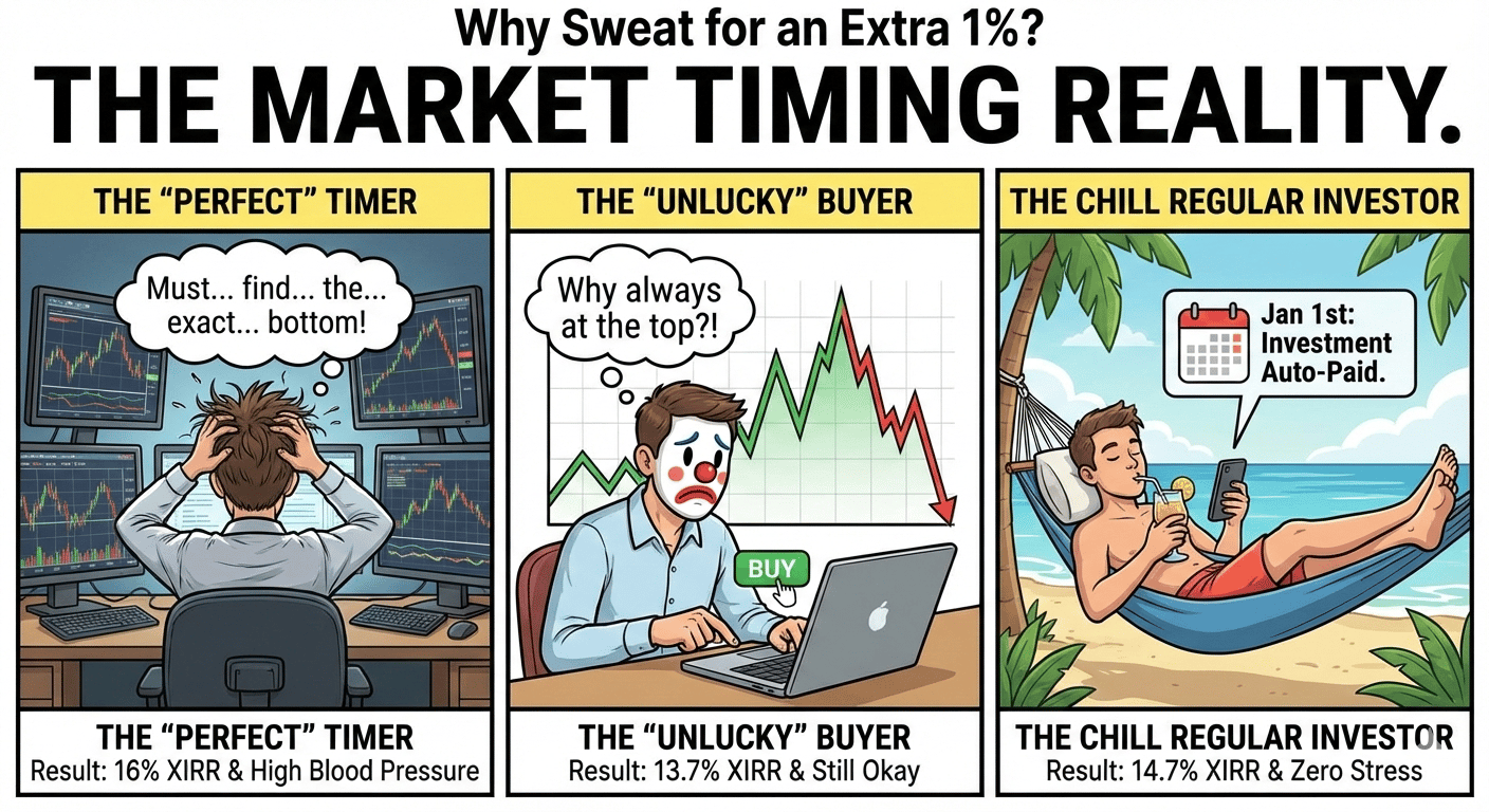 The difference between being a "Market God" (Lucky) and a "Regular Investor" is only 1.3%. While 1.3% matters over 30 years, the effort, stress, and technical knowledge required to perfectly hit the bottom every single year are nearly impossible to sustain.