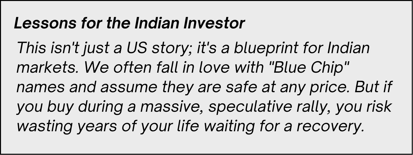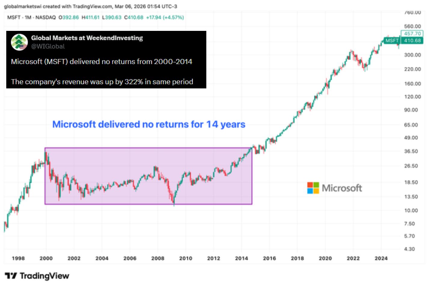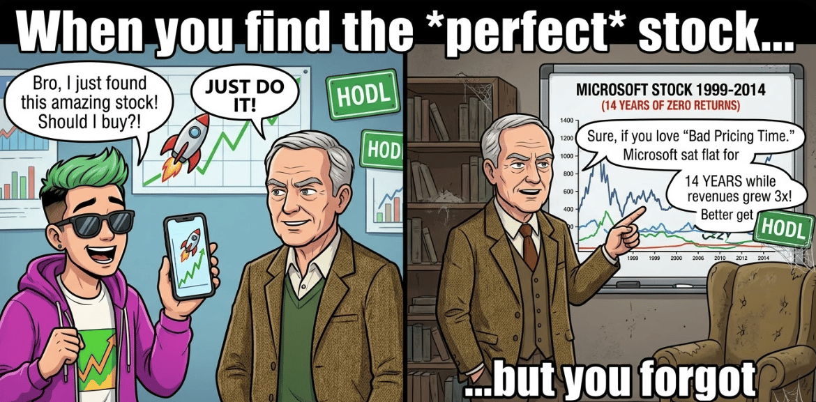 Here is the kicker: during those 14 years, Microsoft’s revenues grew 3x to 4x. The company was performing well fundamentally, but the stock price had been so over-hyped during the 1997–1999 rally (where it went up 10x) that it took years for the actual value to catch up to the "bad pricing."