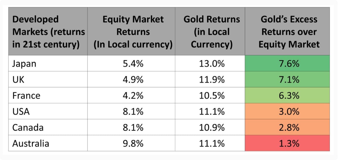 It isn't just a "developing nation" story. High-performing, stable economies like Japan, the UK, and France saw a similar trend. In many of these regions, equity returns hovered around 4%, while Gold delivered nearly 10%.