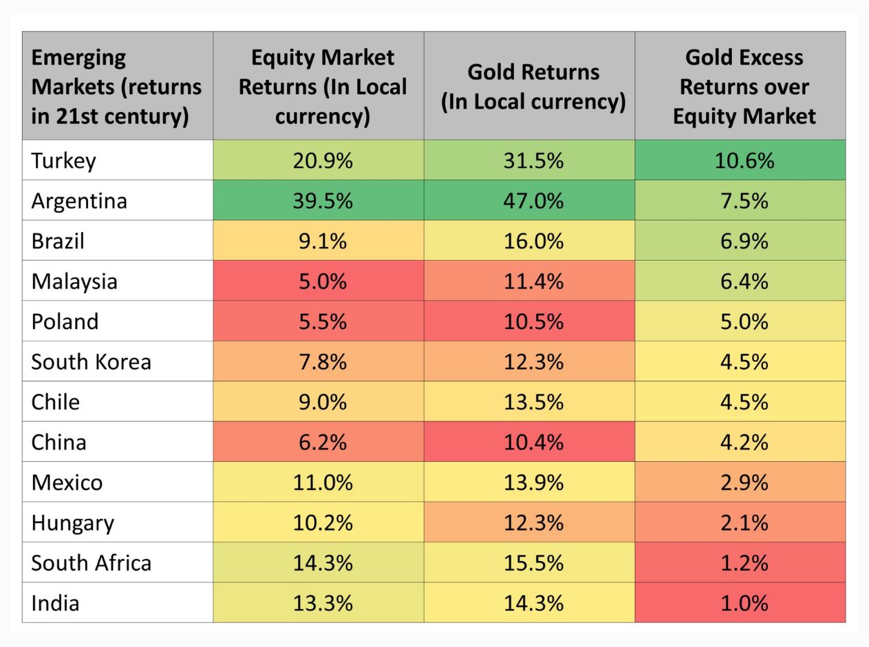 In India, while equity returns of 13.3% are respectable, Gold actually edged ahead with a 14.3% CAGR. In hyper-inflationary environments like Turkey and Argentina, the gap was even wider.