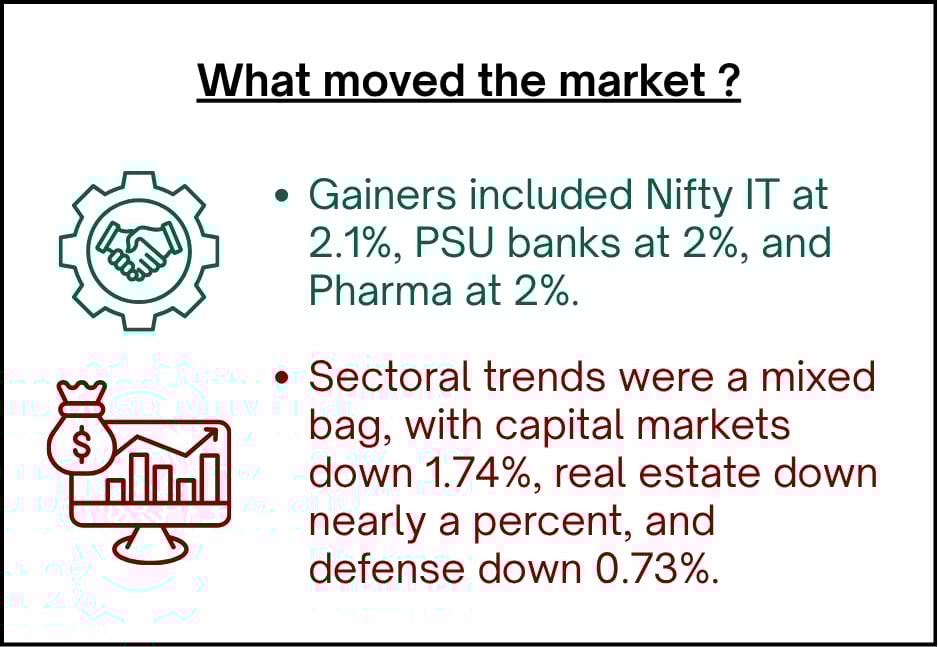 Nifty Junior was flat at 0.45%, while mid-caps rose 0.6%, maintaining a positive short-term trend.