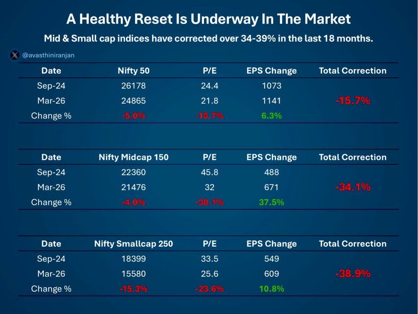 The market isn't always what it seems on the surface. While many investors fixate on the index price, a more profound shift is happening beneath the hood: P/E Contraction. Recent data (courtesy of Edelweiss and Debashish Neogi) reveals that even while earnings grow, the "multiples" investors are willing to pay are shrinking.