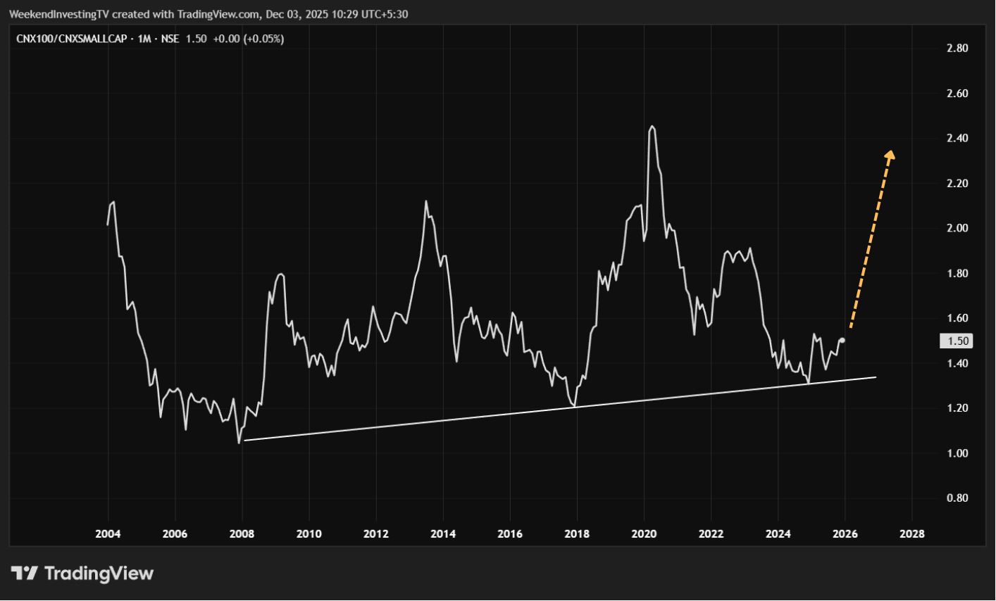 2020 - 2025 (Ratio Falling): Small Caps were in favour relative to Large Caps. (Note: This doesn't mean Large Caps were falling, but Small Caps were growing much faster).