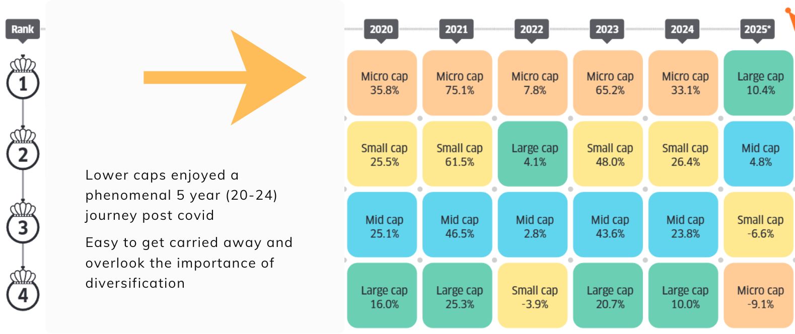 The lingering memory of this stellar performance led to the expectation that 2025 would follow the same trend. Mid Caps performed well too, while Large Caps, initially weak, have recently shown improvement.
