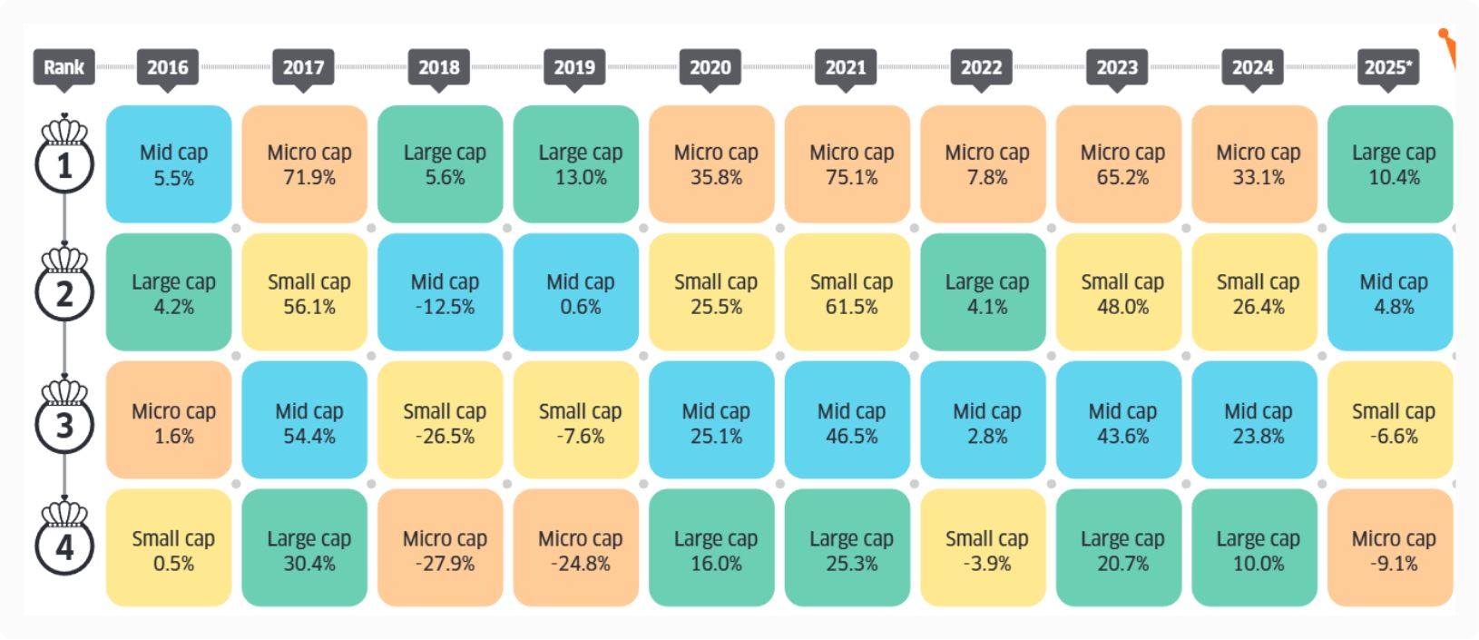 “A passing on the baton, which happens in a relay race, will continue to happen. Sometimes Large Caps are up, sometimes Mid Caps, sometimes Micro Caps, and sometimes Small Caps are down.”